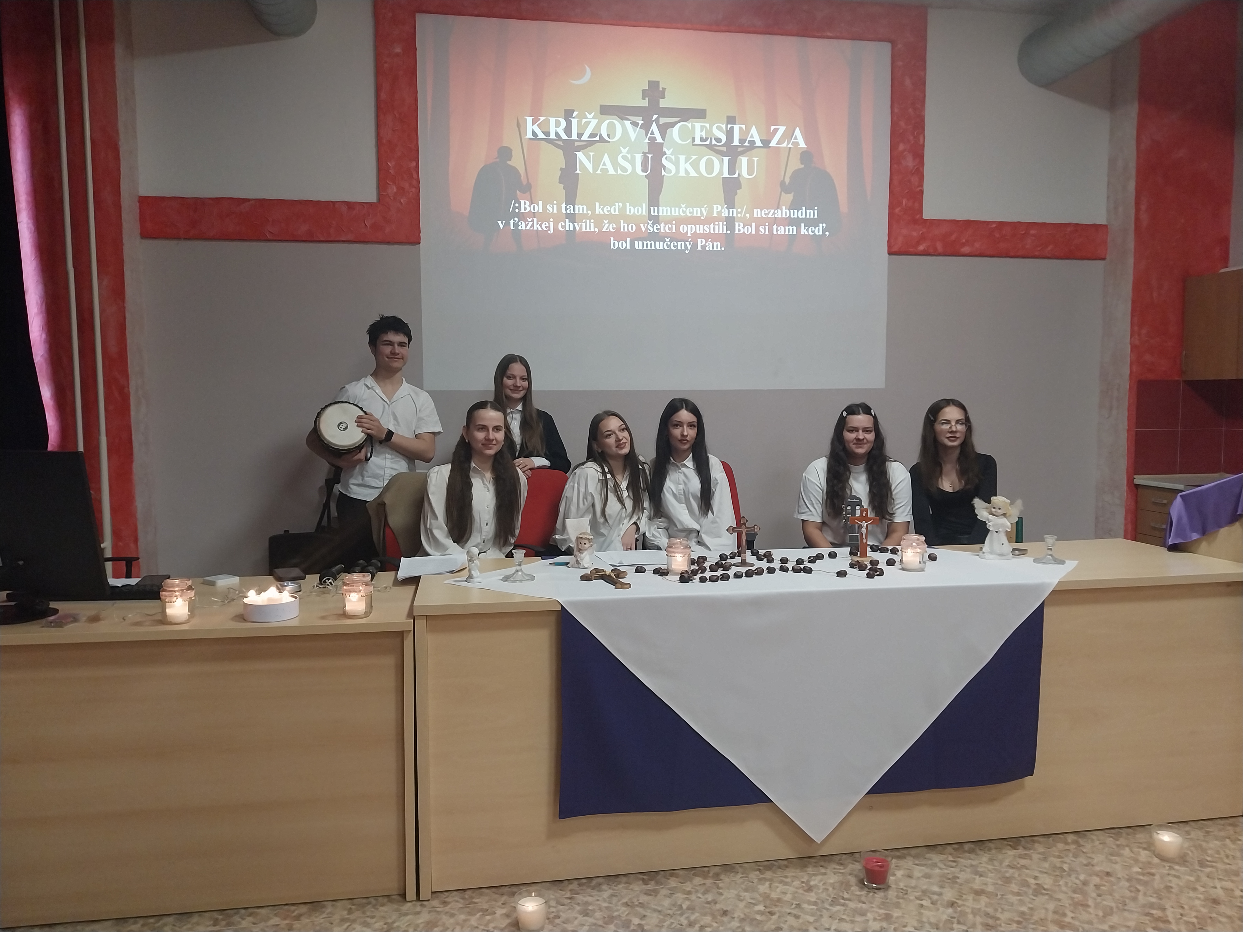 25. marca 2026 sme zrealizovali v AULE SOŠ podnikania a služieb krížovú cestu obetovanú za všetkých žiakov, vedenie a zamestnancov školy. Krížovú cestu viedli naše maturantky – Timea Vraňáková – IV. A, Sofia Lašťáková – IV. A, Antónia Bruníková – IV. B, a to už štvrtý rok. Vytvorili u nás v škole krásnu tradíciu, ktorá sa spája s duchovnou prípravou na Veľkú noc. Pomohli im aj naši prváci – Rebeka Brišová – I. D, Adela Zaťková – I. D, Tobiáš Žembéry – I. D. Takto vytvorili organizátori krížovej cesty aj s účastníkmi silné školské spoločenstvo s duchovnými hodnotami.