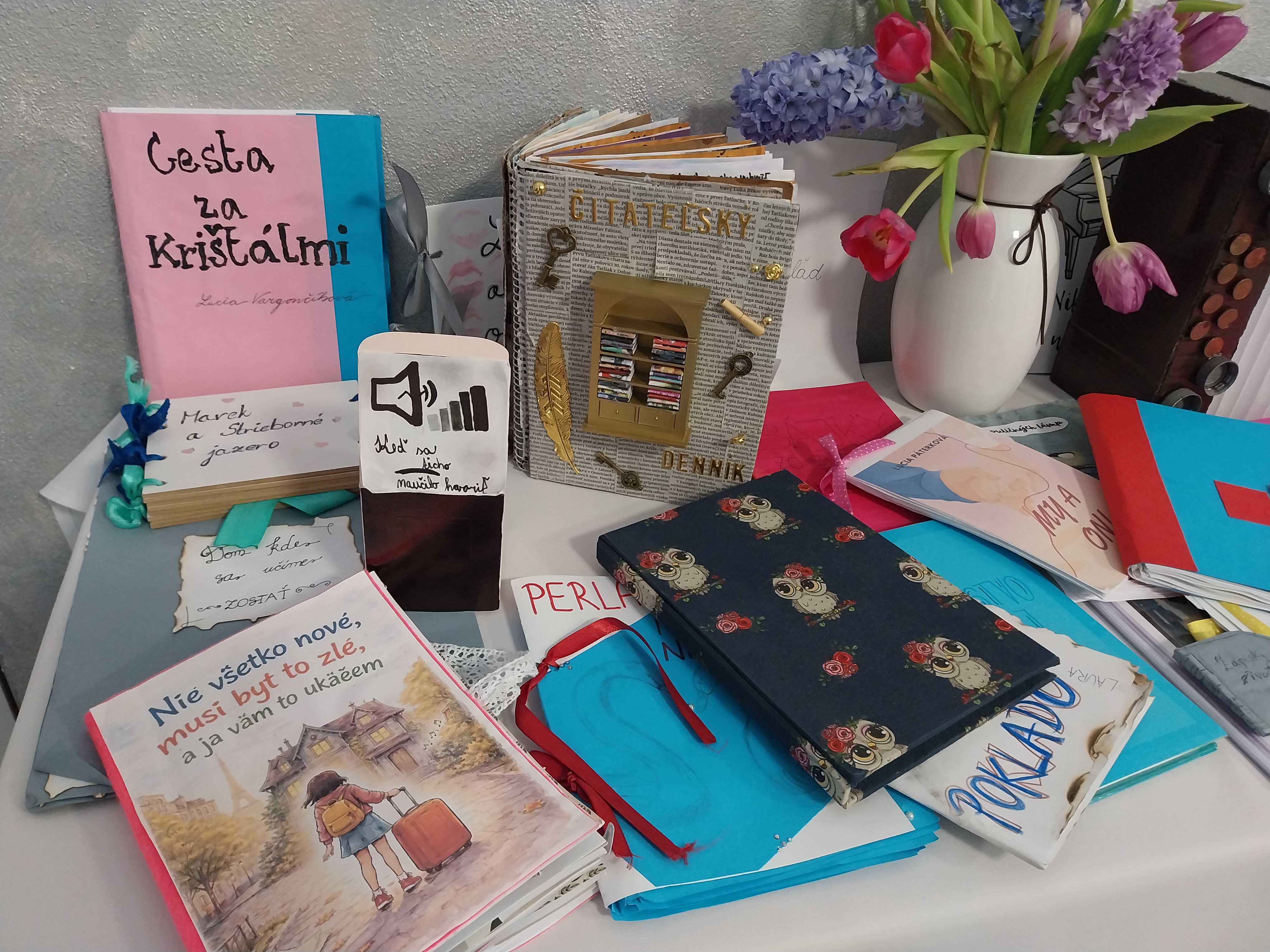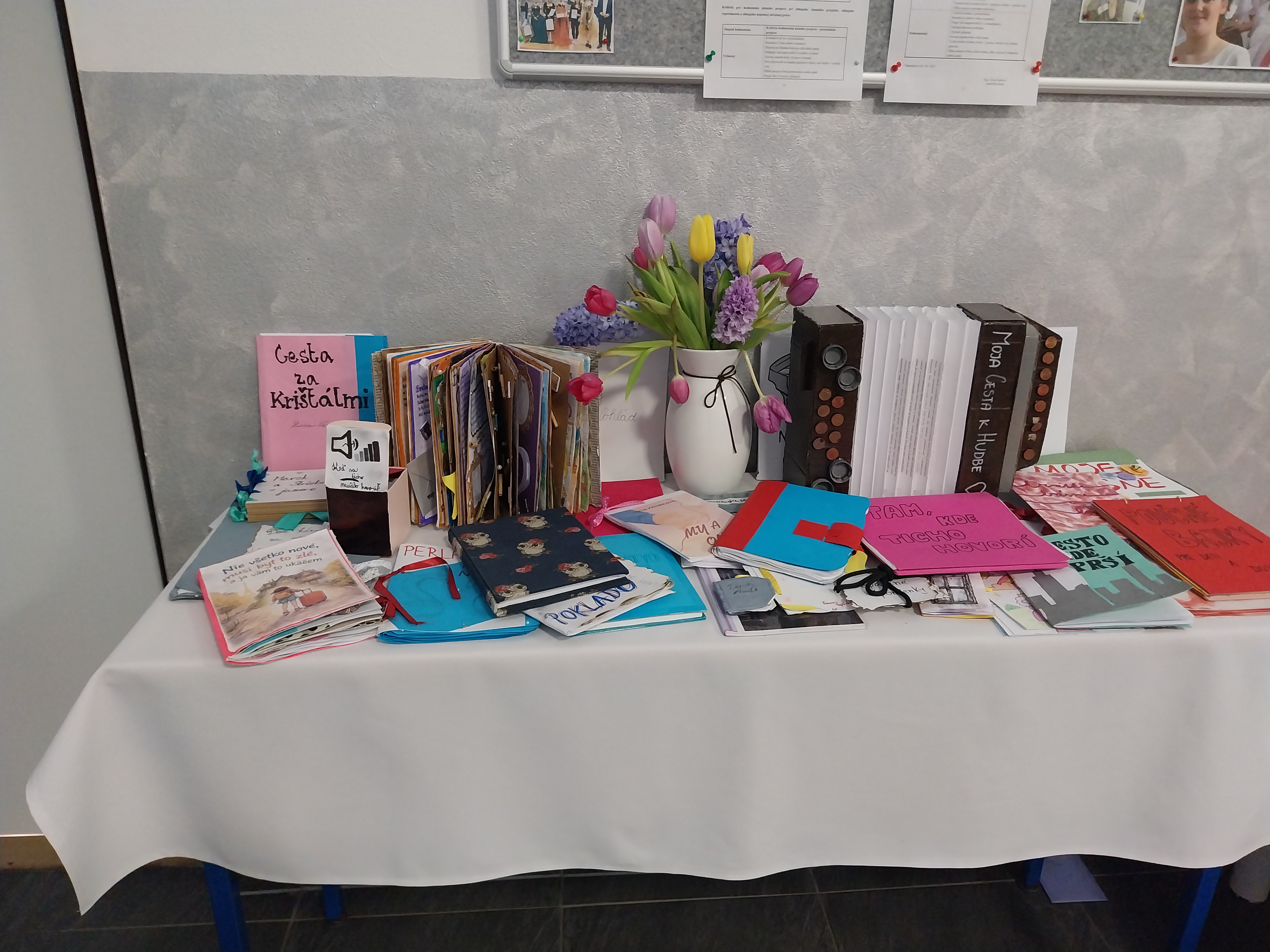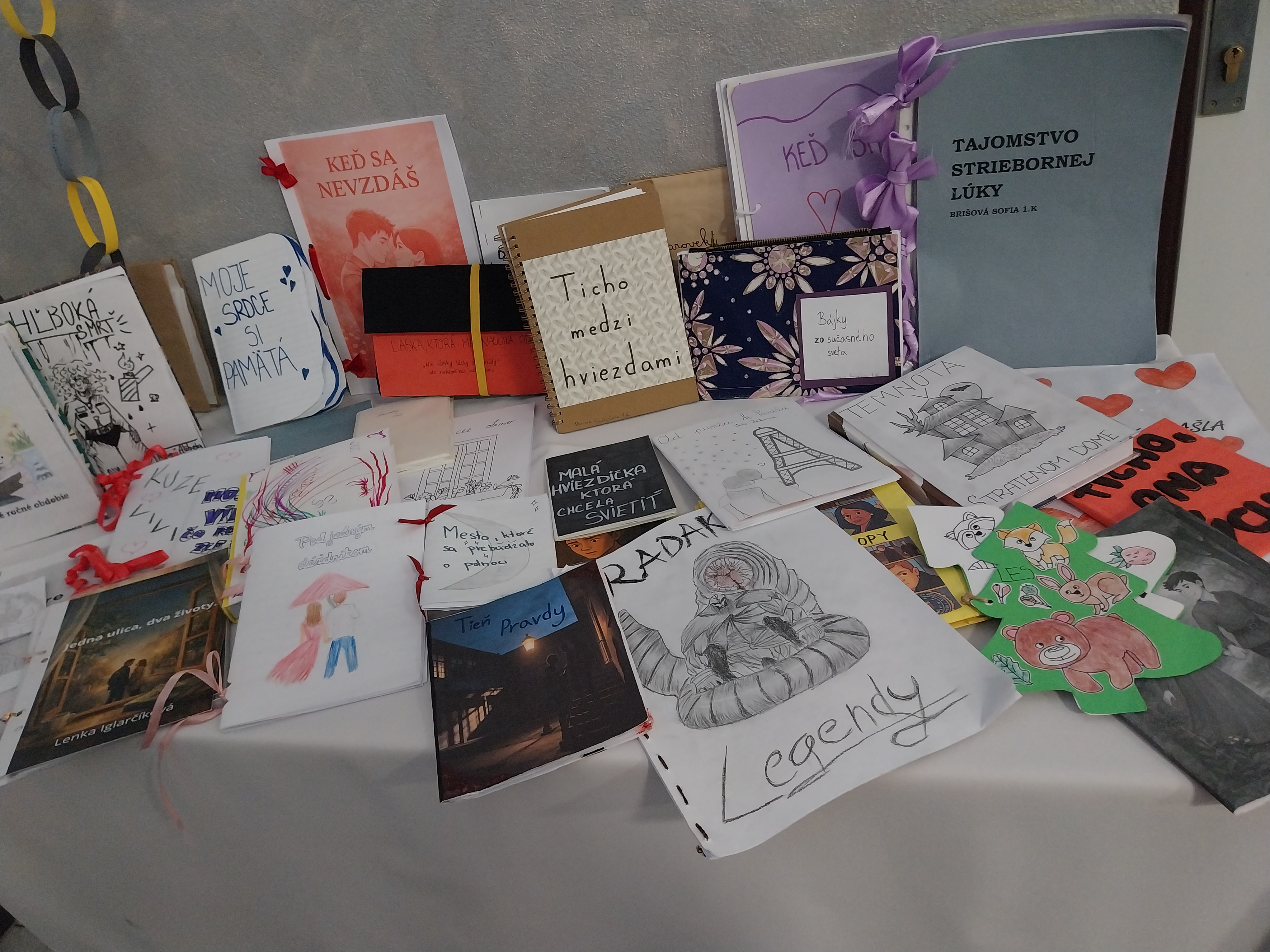 Žiaci tvorili vlastné knihy, ktoré boli už vyhodnotené odbornou komisiou a na 2. poschodí zdobili výstavné stoly.