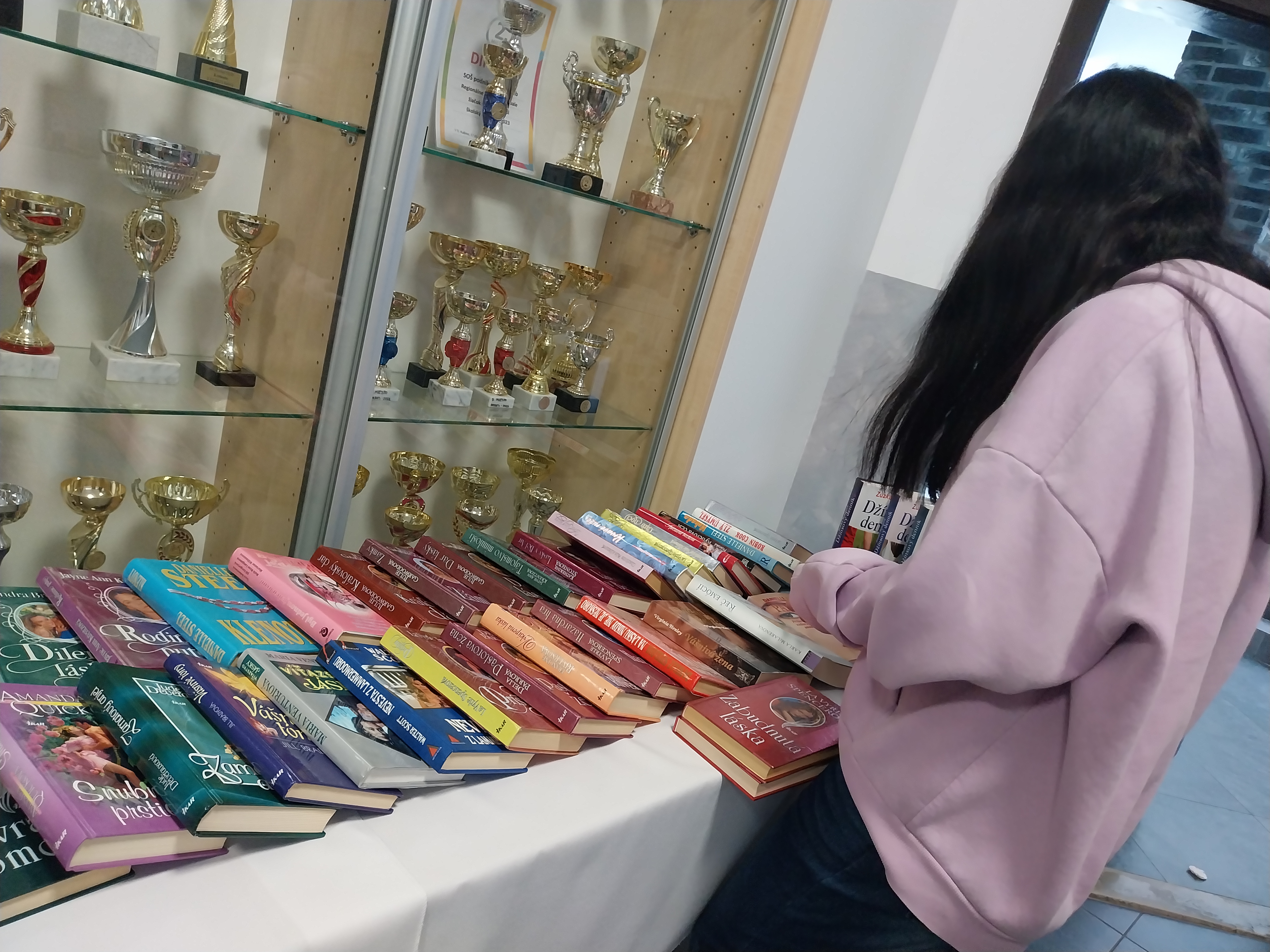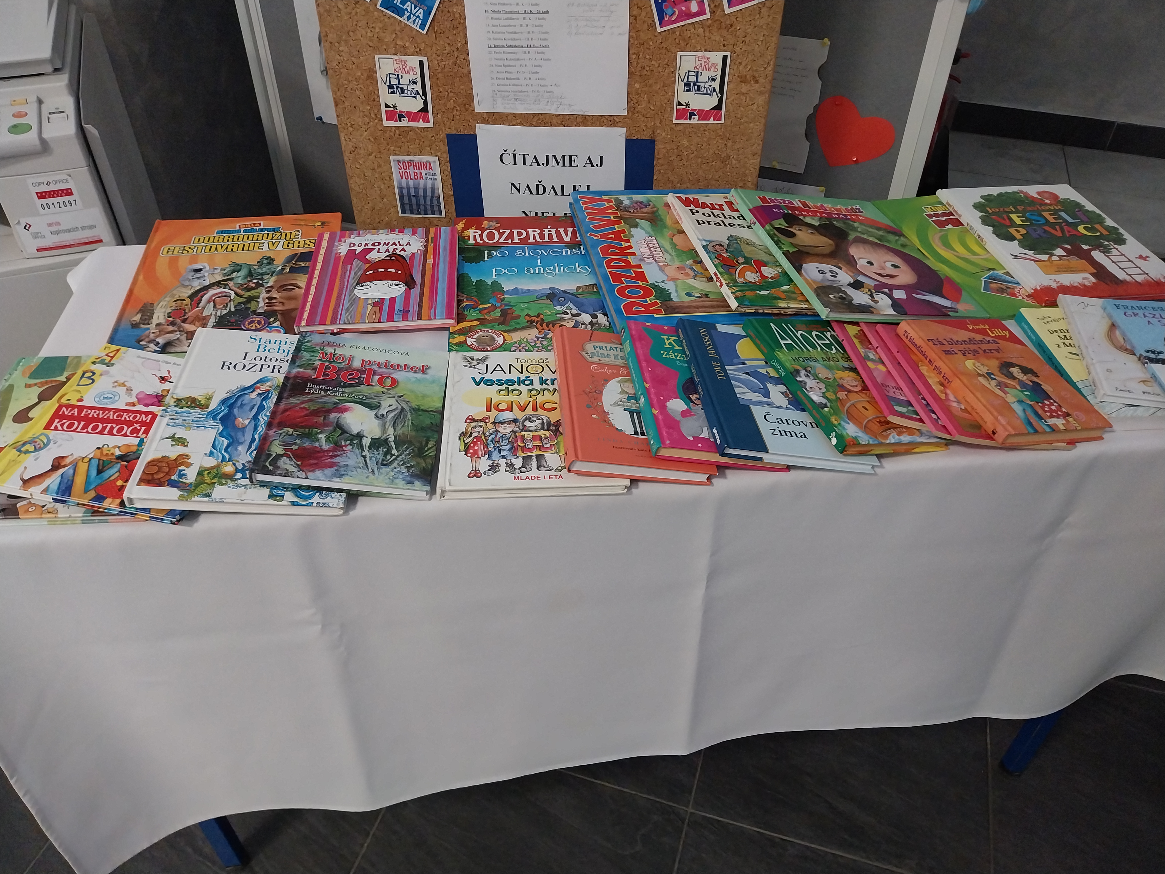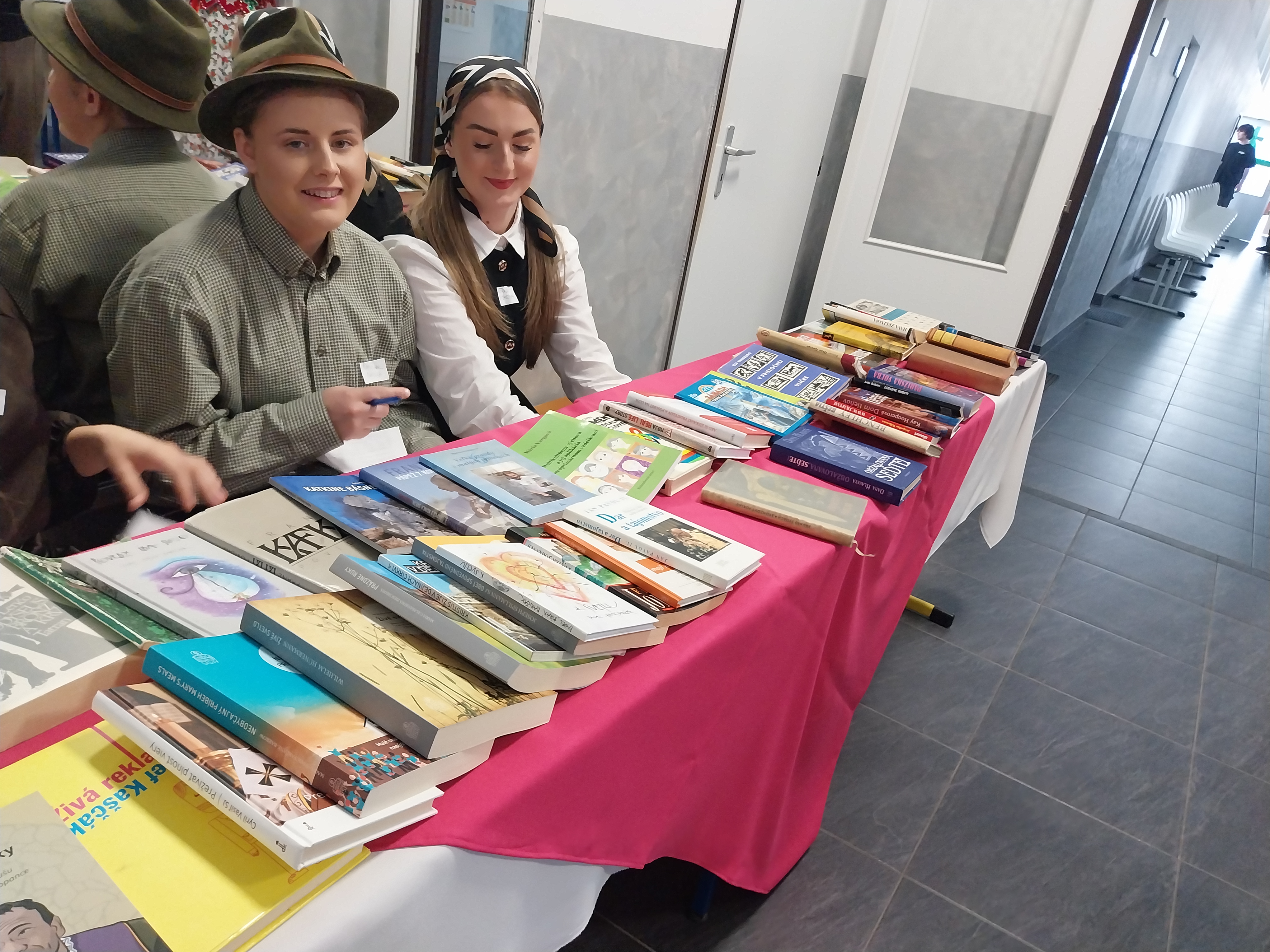 Žiaci tvorili vlastné knihy, ktoré boli už vyhodnotené odbornou komisiou a na 2. poschodí zdobili výstavné stoly.